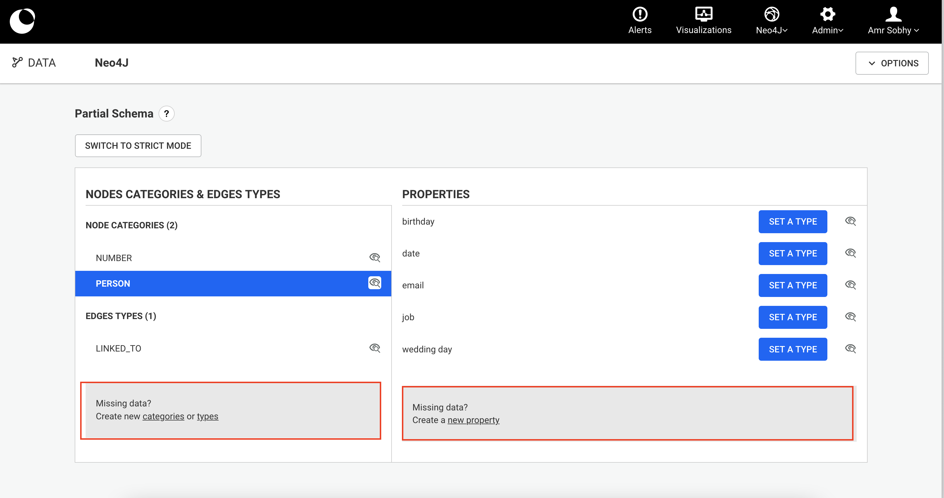 - Partial mode (default). The schema is the combination of what is detected automatically by Linkurious Enterprise and explicit declaration from the administrator.
