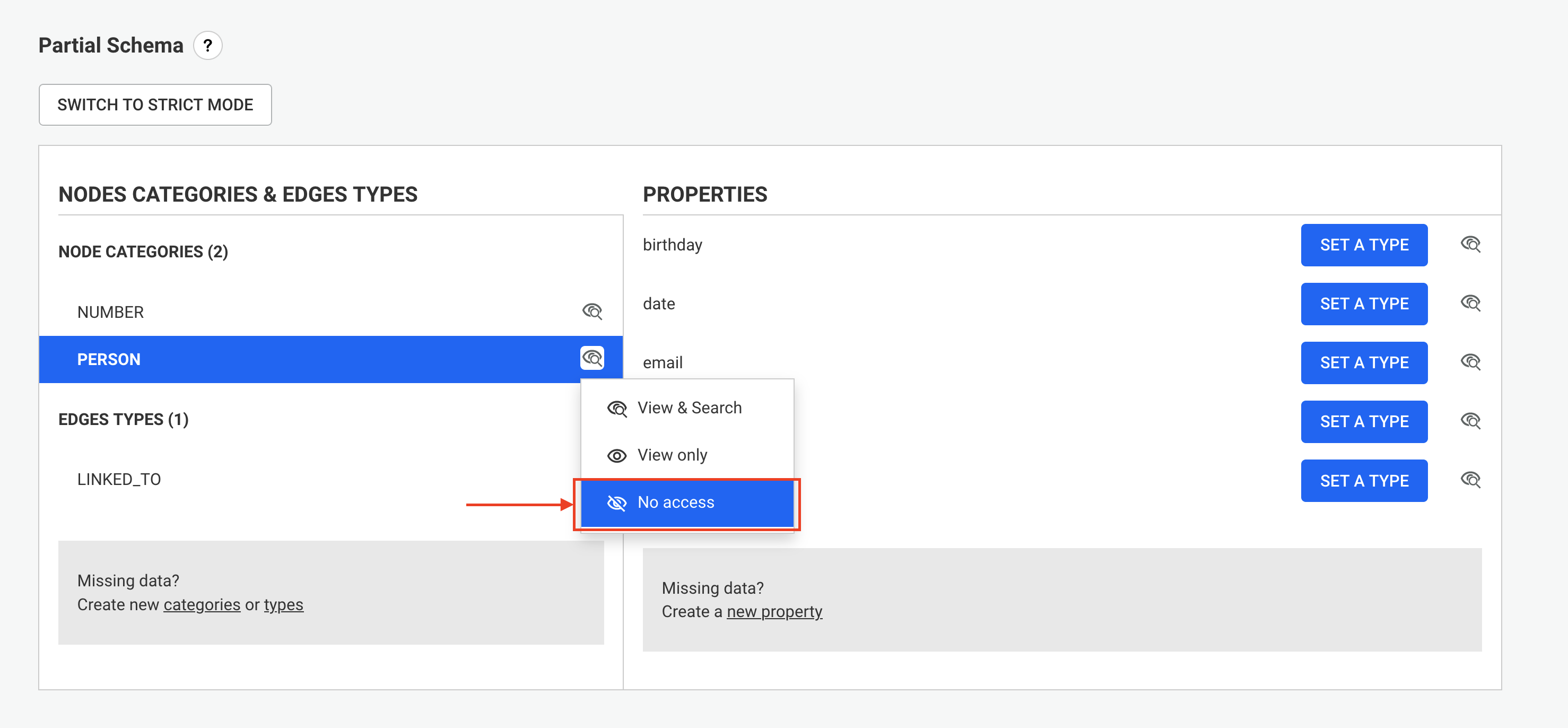 The "eye" icon next to node categories, edge types and properties allows to switch the visibility to View & Search, Only view or No access. See the dedicated section for more details.
