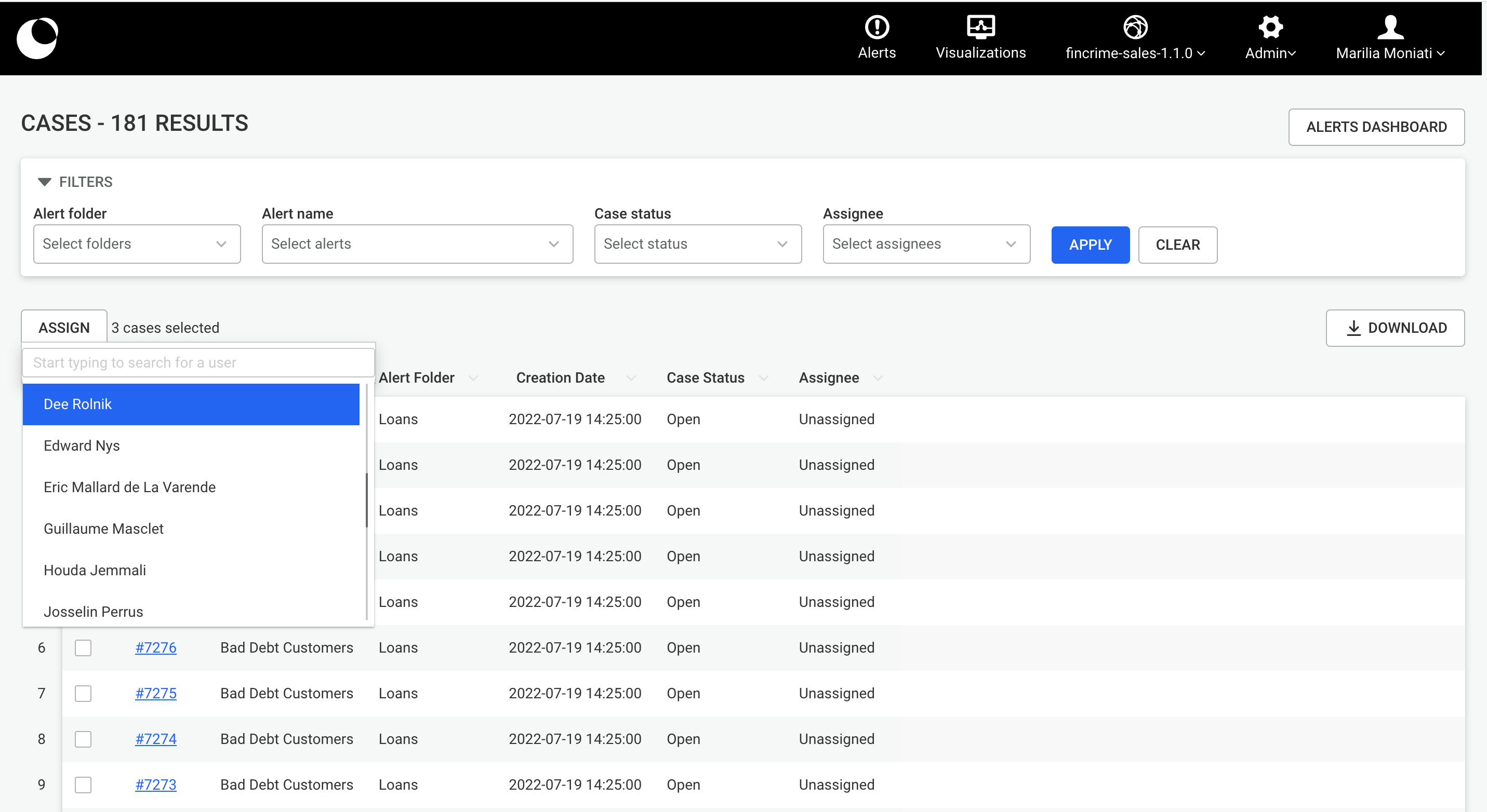 Once the user is done selecting cases, they will pick a user name from the dropdown list that opens upon clicking on the “ASSIGN” button. Only the users who have access to all the alerts to which the selected cases belong, will show on the list. If a user is lacking access to at least one of the cases’ alert, they won’t be displayed. Also, if new filters are applied or if filters are cleared, the current selection of cases is unselected.