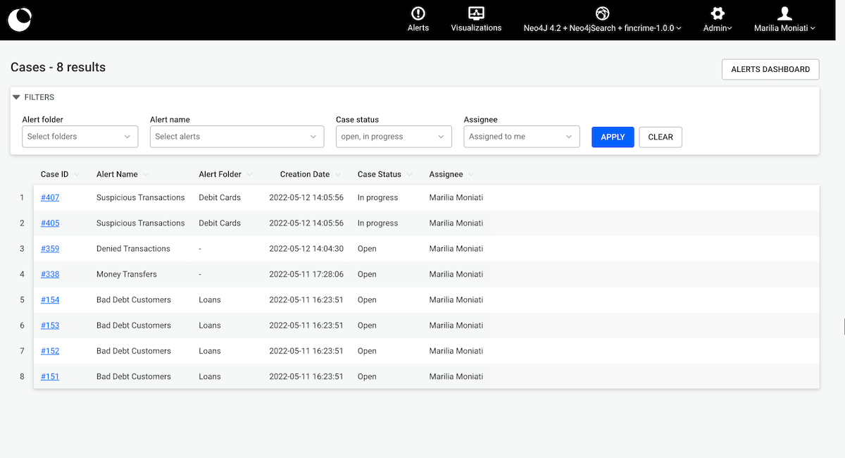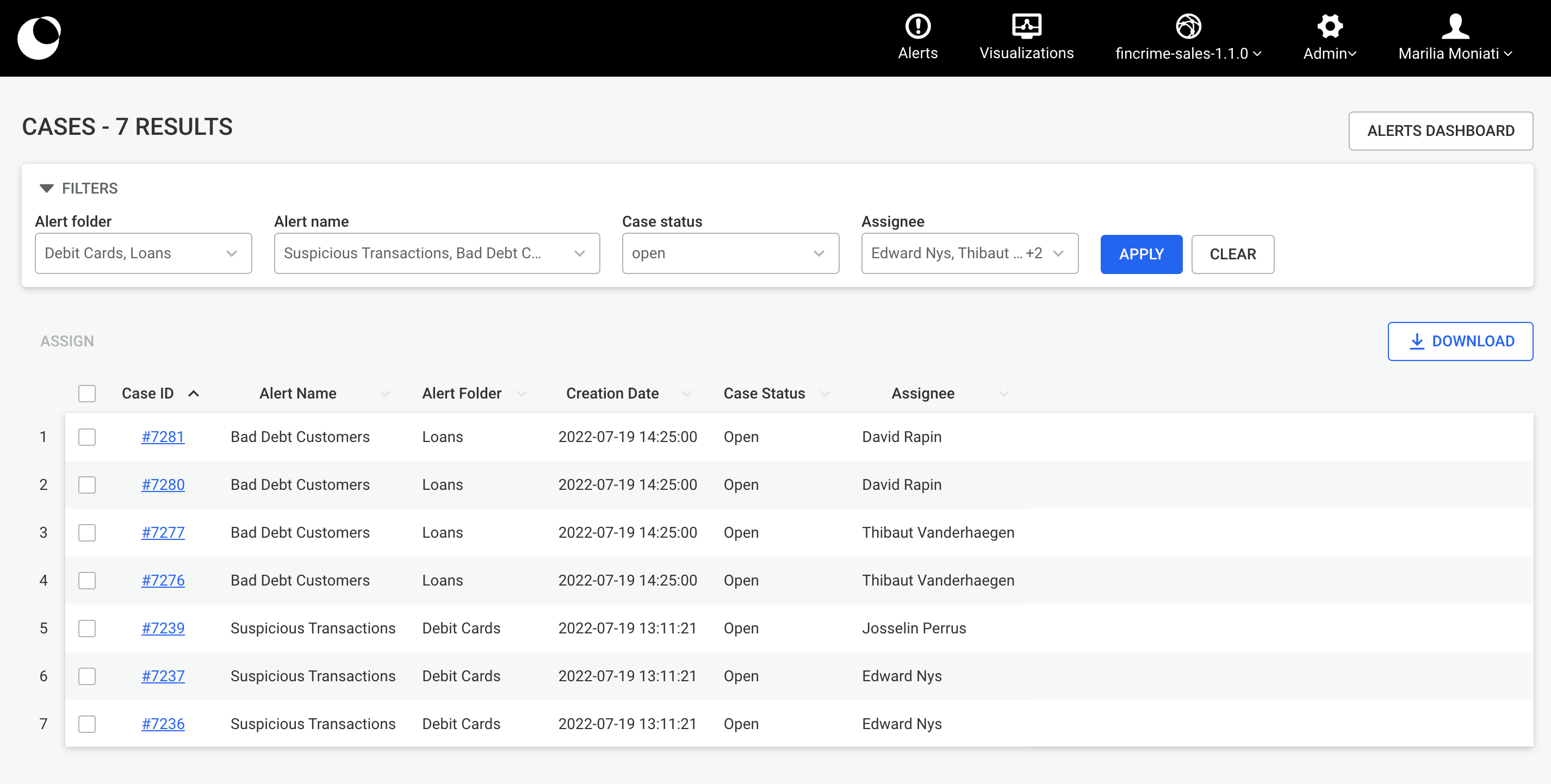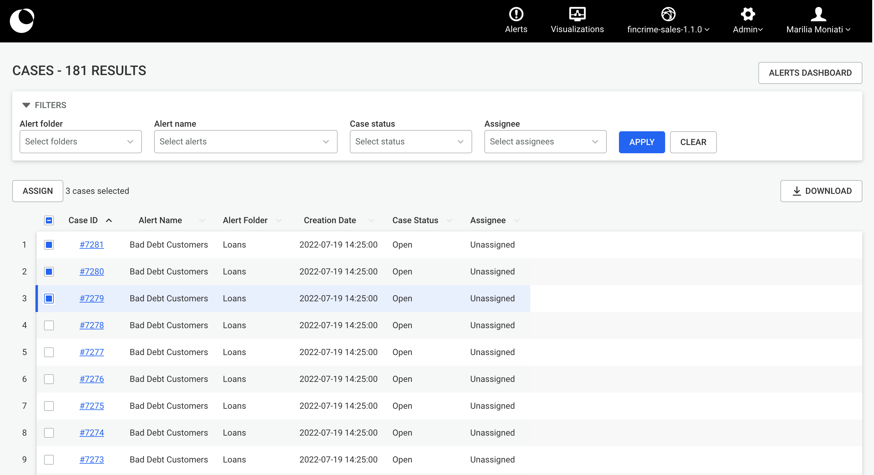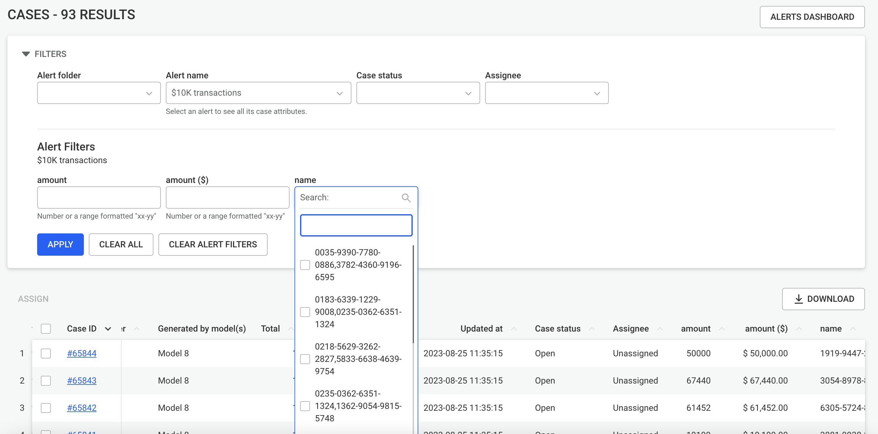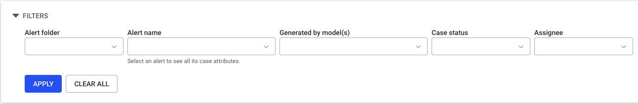 Different combinations of filters can be applied. Users can filter by one or many Alert folders, Alert names, Alert models, Case statuses and Assignees. When filters are cleared, by clicking on the clear button, all the cases a user has access to are displayed.