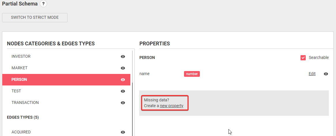 Editing permissions are related to the configuration of Access Rights. If you are not able to edit a node (resp. an edge), see a specific property, or perform one of the above actions, please get in touch with your administrator.