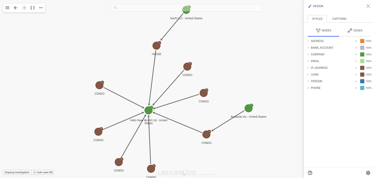 In the picture below, we see that company Hello New World Ltd is connected to many loans. At first glance we have no idea where these loans are for.