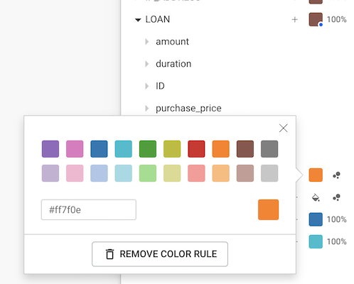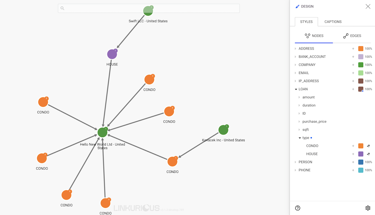 For example, our nodes with category LOAN may have a type property that we would like to highlight; Linkurious Enterprise enables us to color the nodes according to a particular property, here type.