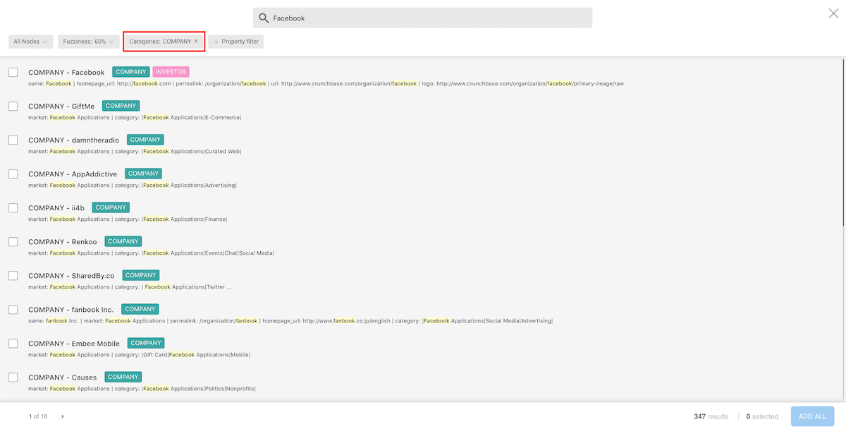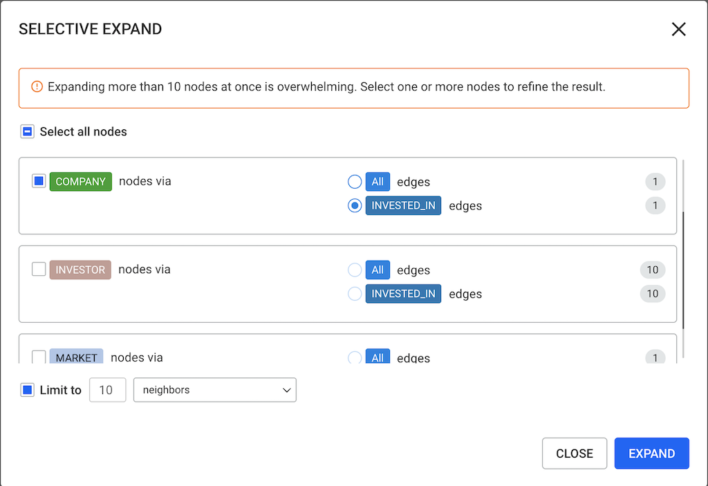 If your selection includes multiple node categories or edge types, each will be shown in its own separate table for clarity.