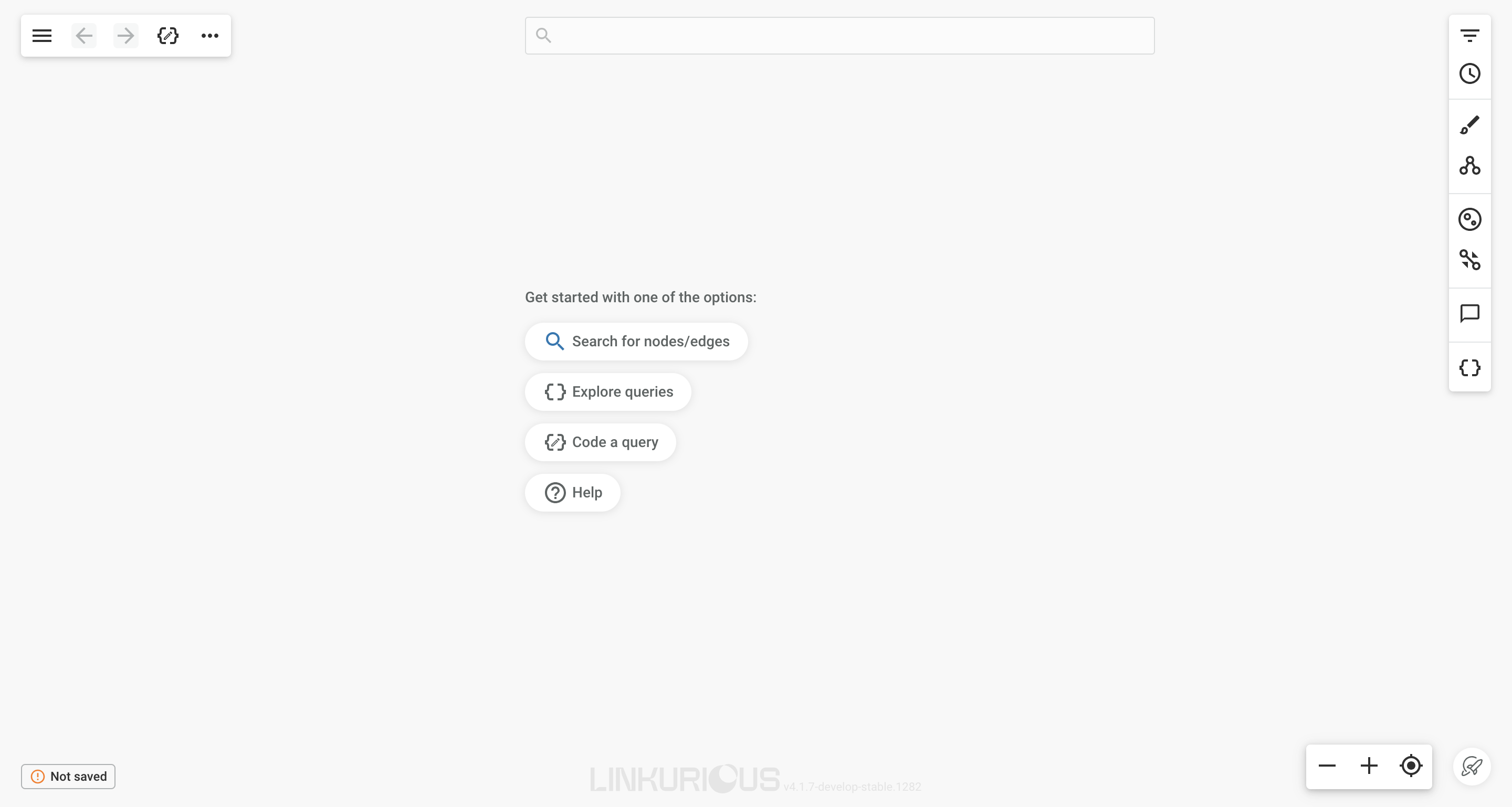 Upon entering the visualization's workspace, you can see the quick actions menu (as shown in the screenshot below) which will guide you on key steps to take in order to start your investigation. You will be one click away from searching for nodes, exploring and running existing queries, coding a new query or accessing Linkurious Enterprise documentation.