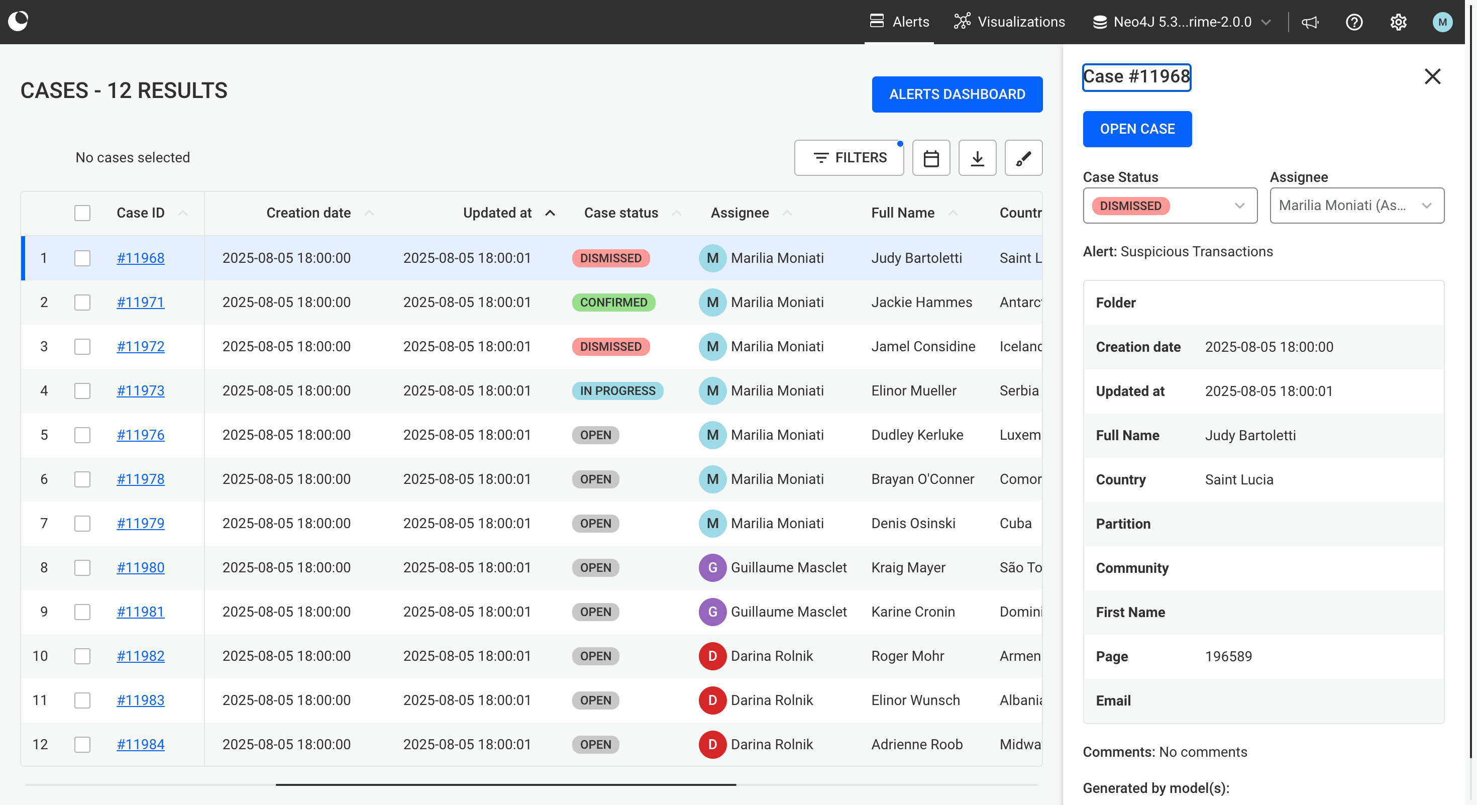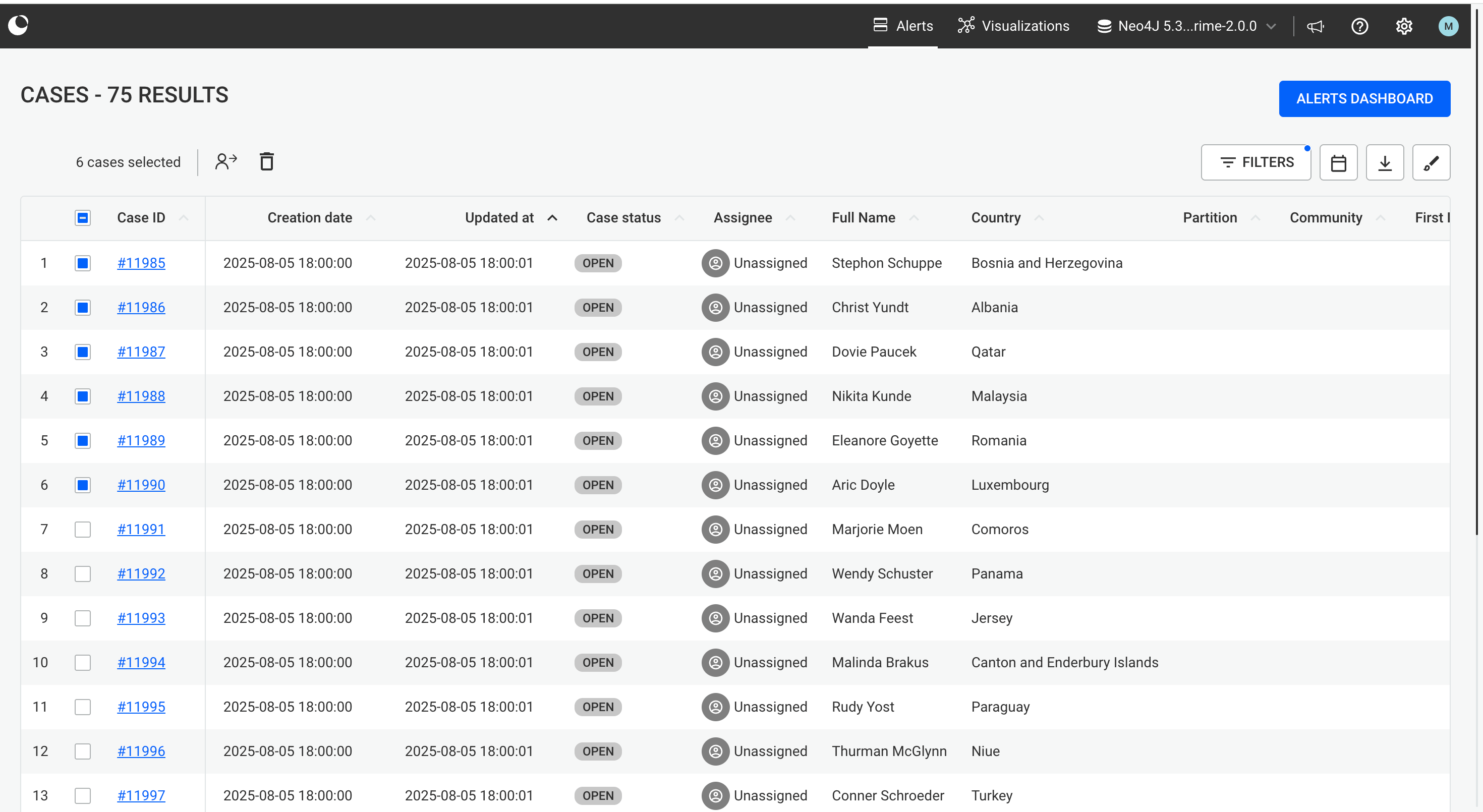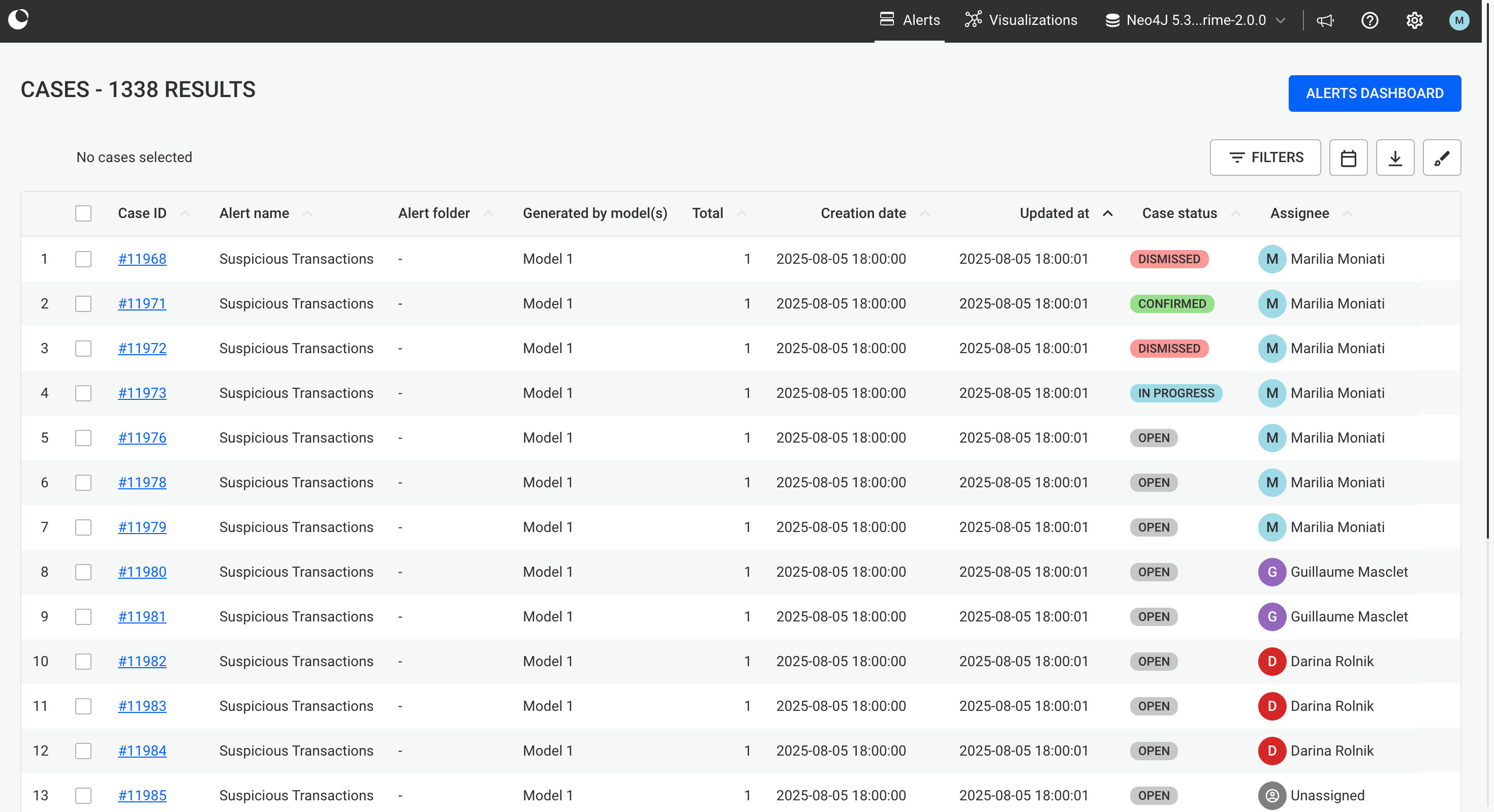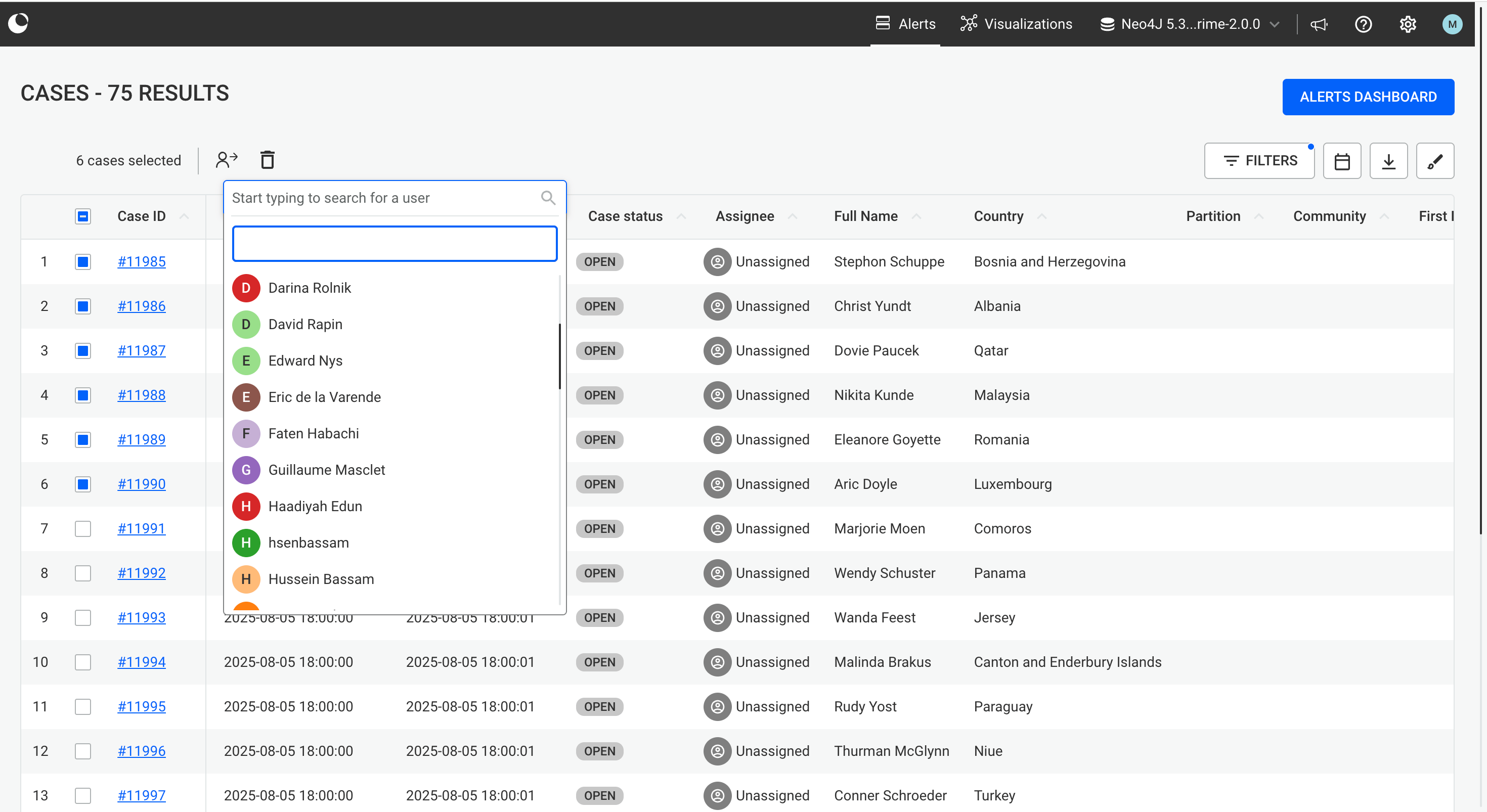 Users can assign one or multiple cases to another user or themselves in one go, from one or many alerts at a time. This is particularly useful for a team leader dispatching the workload among their team, especially in combination with the usage of filters.