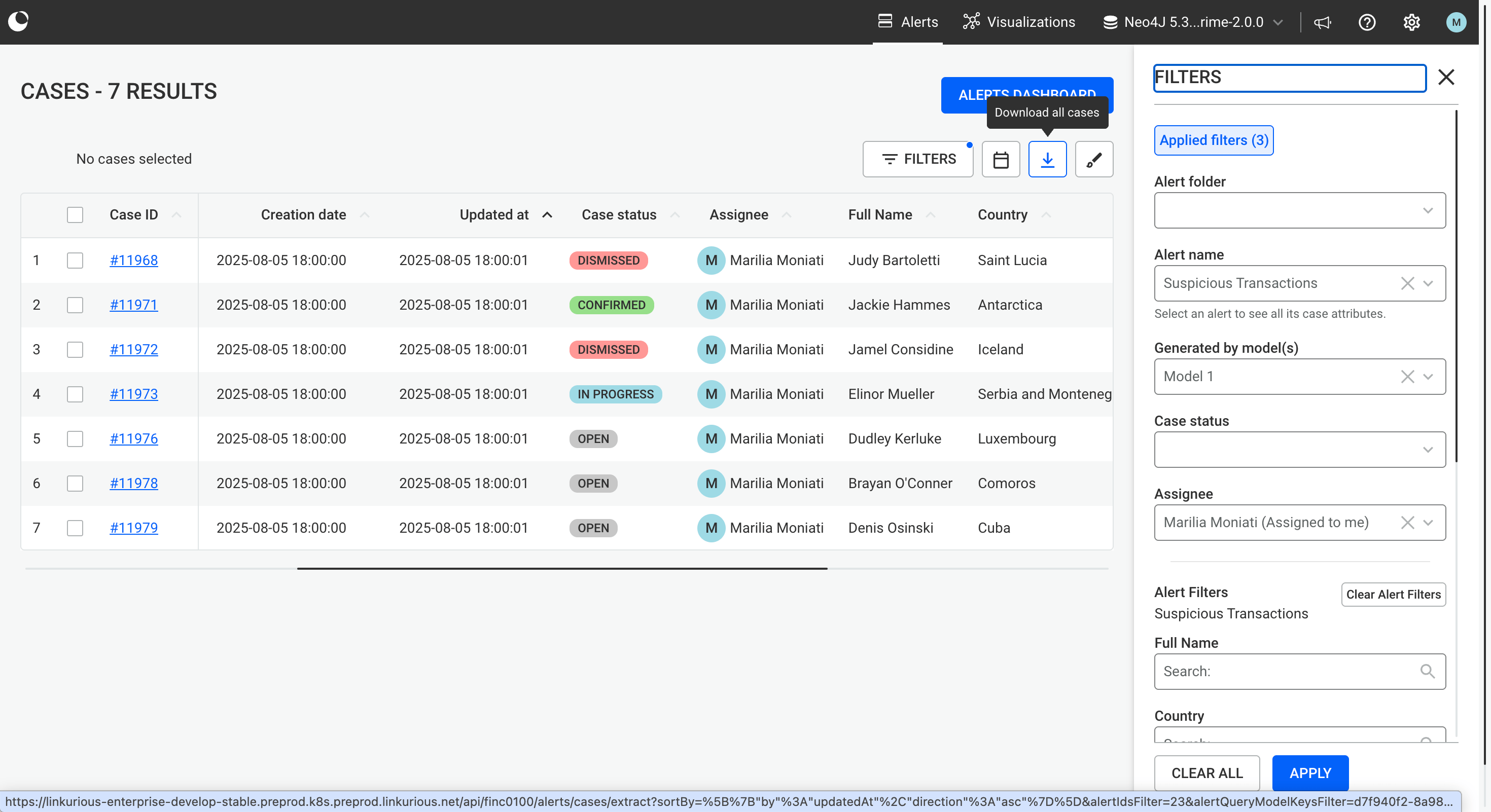 From each alert's case list view, users can download an excel file containing all the cases of the alert. This file contains information which will enable analysts to monitor the team's activity, share it with fellow colleagues and answer possible questions a they may have, such as: