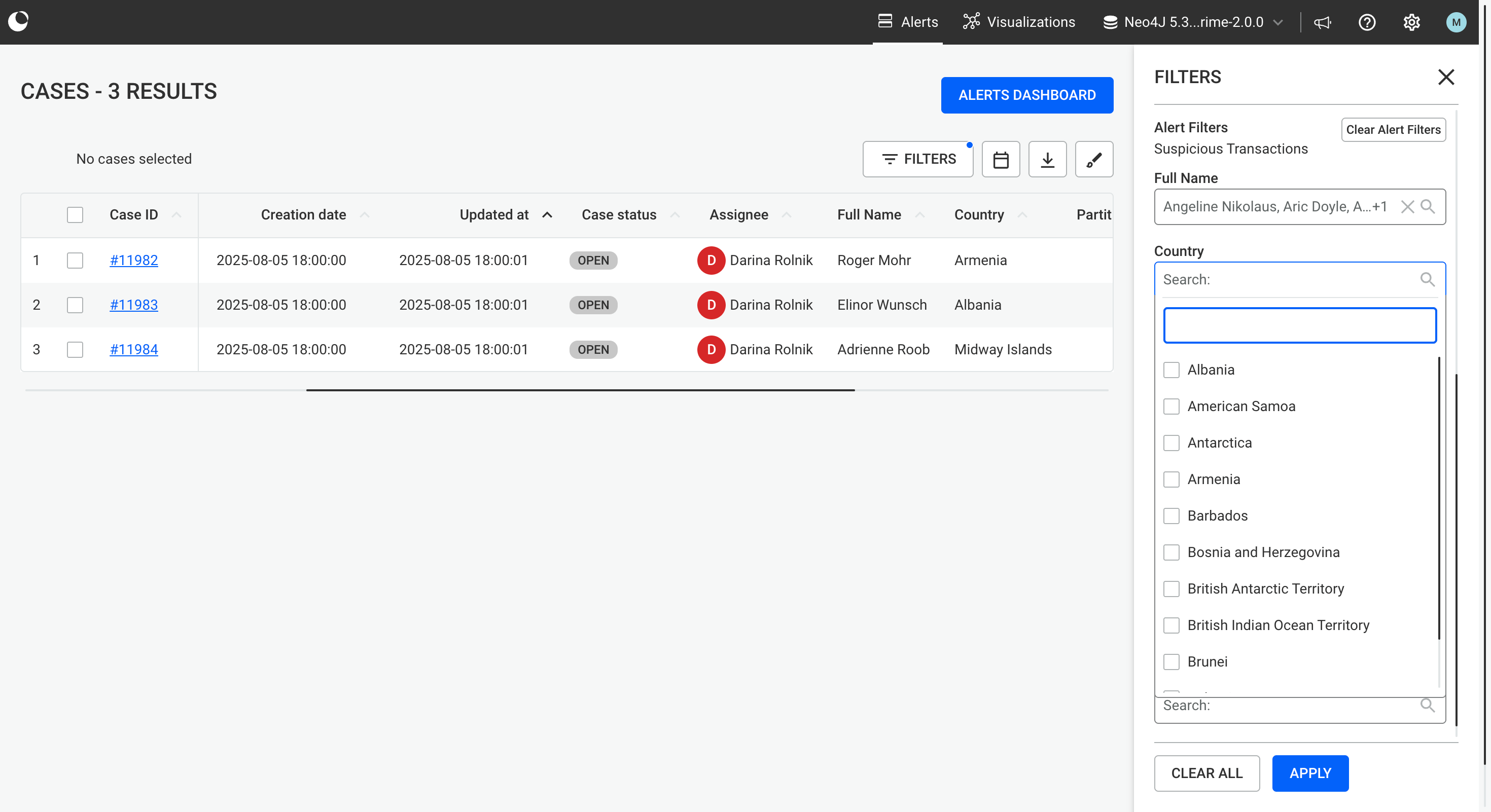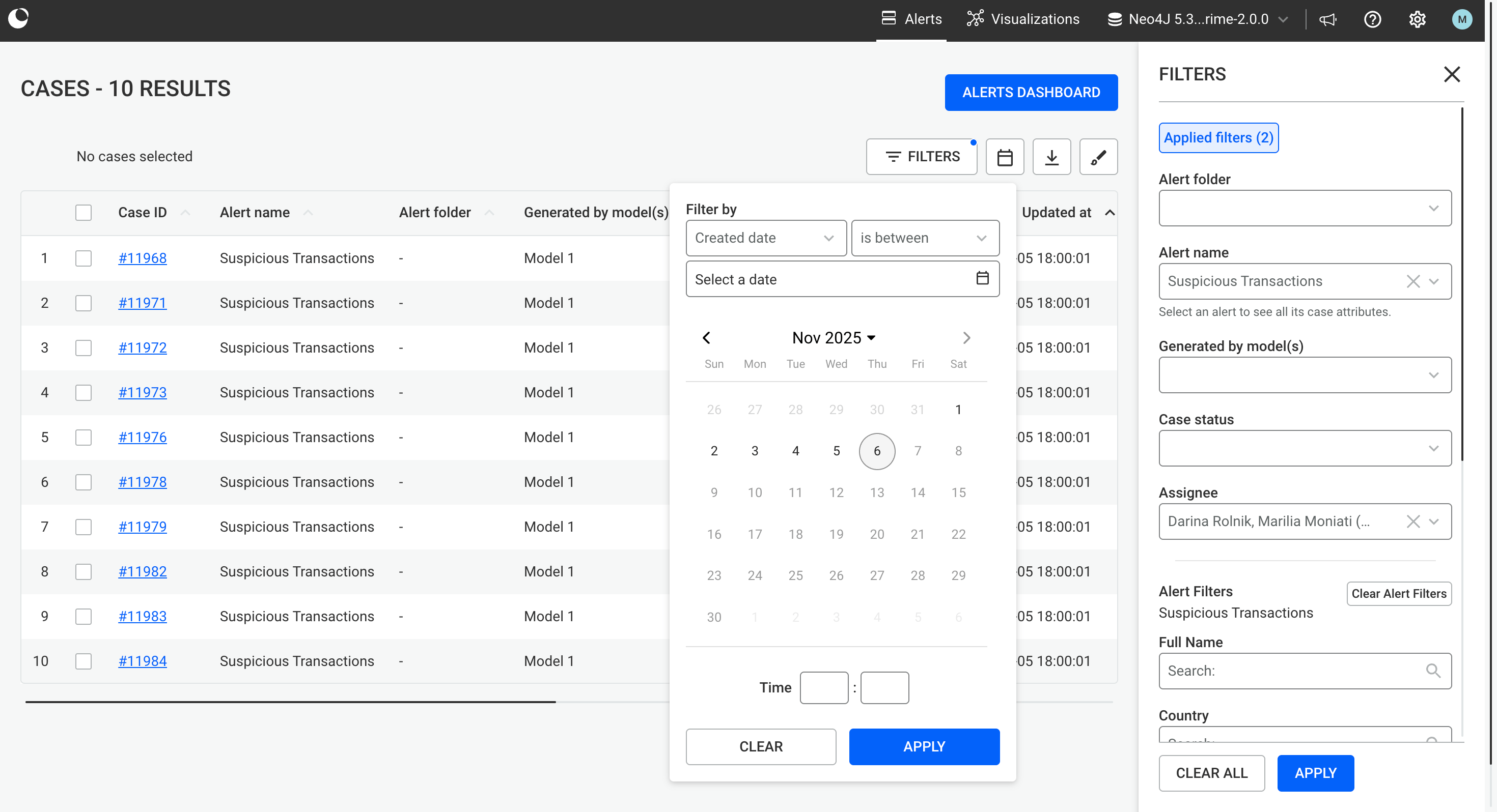 Different combinations of filters can be applied. Users can filter by one or many Alert folders, Alert names, Alert models, Case statuses and Assignees. Users can also filter by Created At and Updated At to add a chronological perspective to their results. When filters are cleared, by clicking on the clear button, all the cases a user has access to are displayed.
