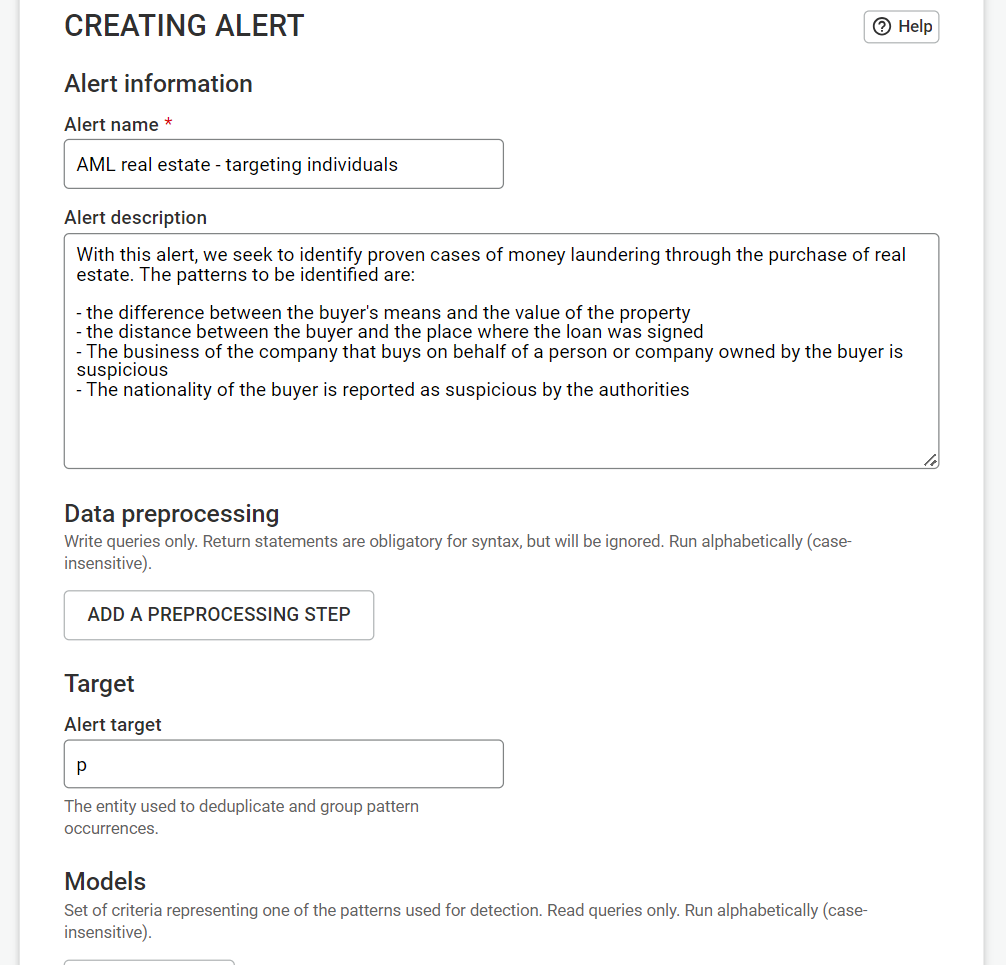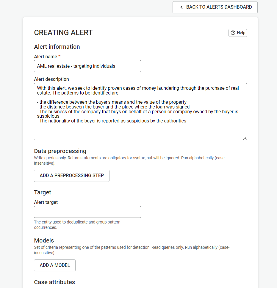 In order for cases to be deduplicated properly, users have to set a target for their alert. The target is the entity used to deduplicate and group pattern occurences. The value of the target can be anything and it will have to be used in all the models that will be added to the alert.