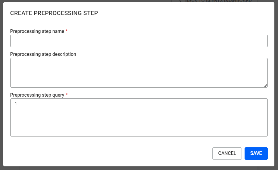 The model name and model query are mandatory fields and are needed in order to save a model. The model query should be a read query. In case the user writes a write query, saving the model will not be possible. Write queries can instead be input as data preprocessing steps (see below). Once the model is successfully saved, it will become visible on the list of models on the alert creation page. From there, if the model has any syntax errors or if the target is not found within the model, users will be able to see them. Consequently, users are able to edit and or delete models by clicking on the corresponding buttons.
