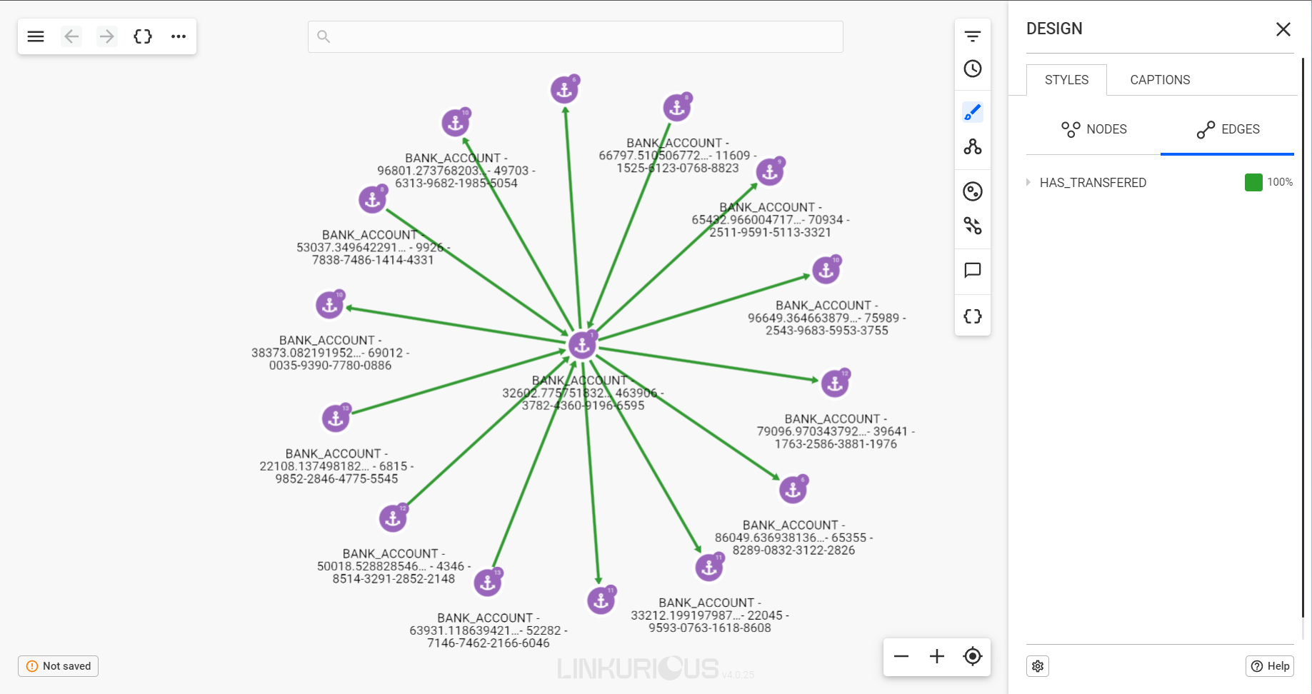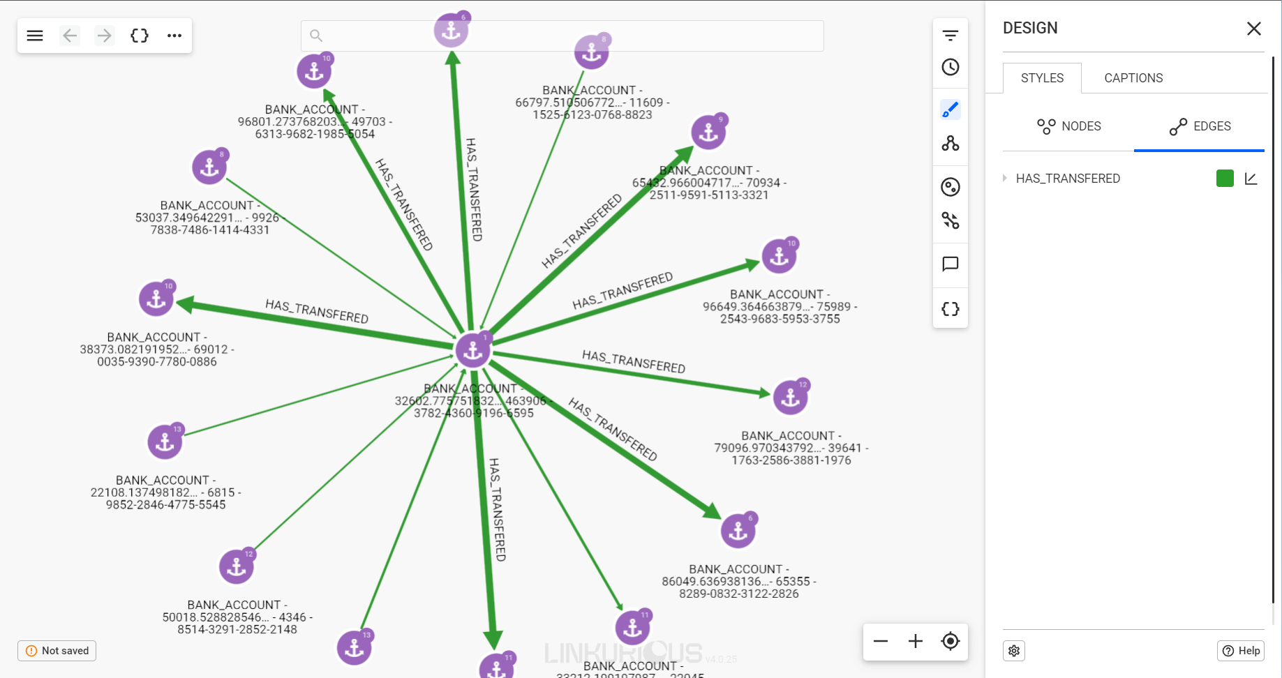 Now we can see that the size of the edges with the type HAS_TRANSFERED has changed – the larger the size of the edge, the bigger the amount transfered.