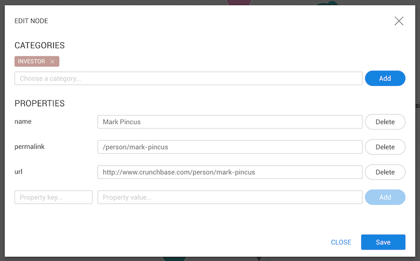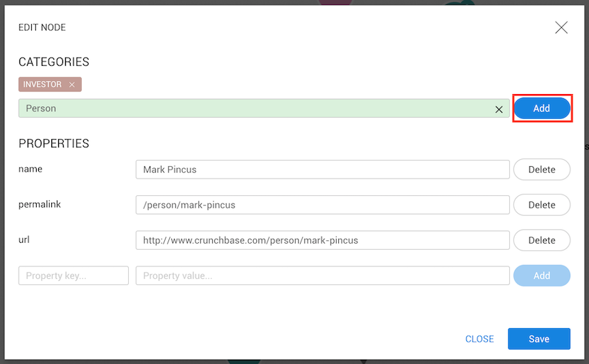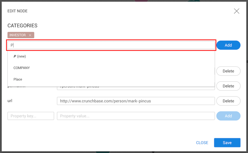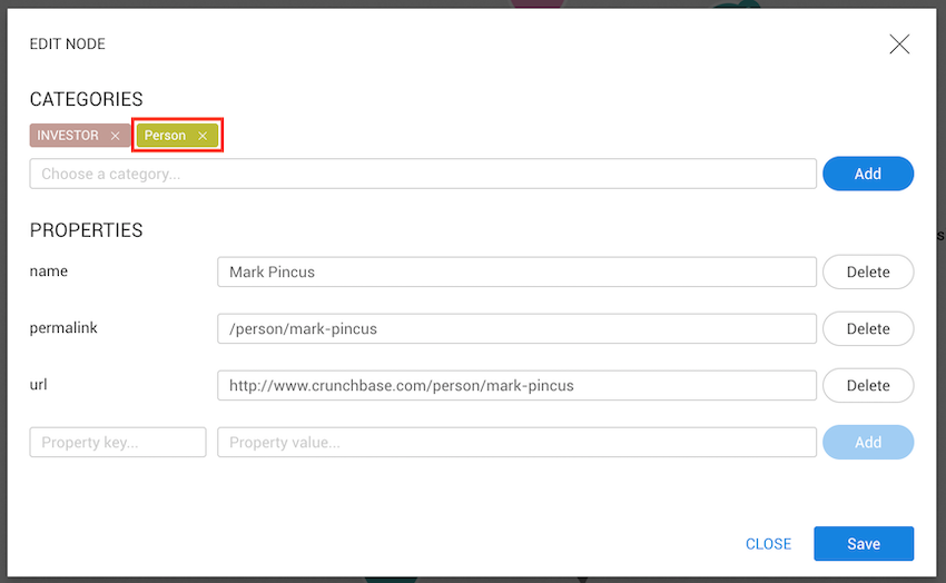 Node categories are used to tag a node (e.g. Company). Some graph databases (e.g. Neo4j) support multiple node categories.