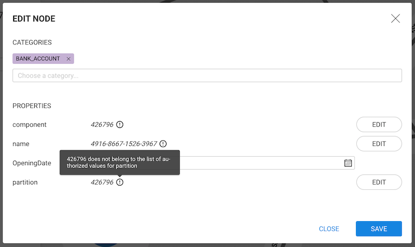 Editing permissions are related to the configuration of Access Rights. If you are not able to edit a node (resp. an edge), see a specific property, or perform one of the above actions, please get in touch with your administrator.