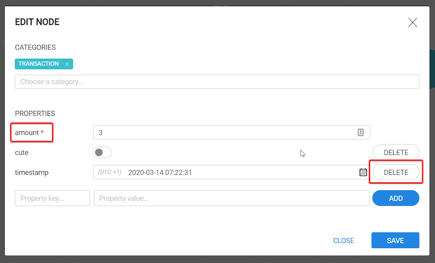 To remove a property, we only need to click on the Delete button. You cannot delete properties that have been marked as mandatory by an administrator. Mandatory properties have a red asterisk.