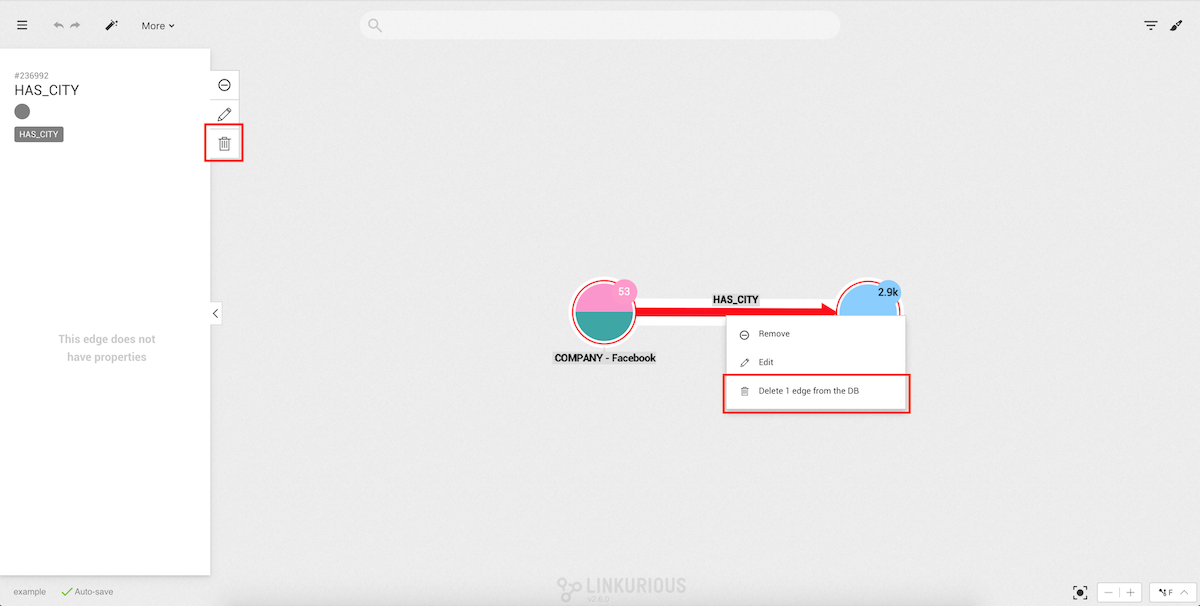 If we want to delete one or more edges from our database, we need to select the edges we want to delete and right-click on one of them or on the Delete option in the selection panel.