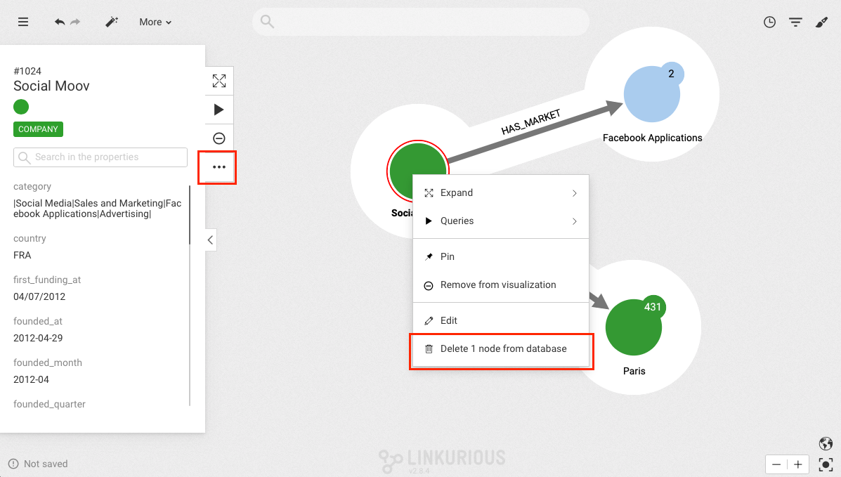 If we want to delete one or more nodes from our database, we need to select the nodes we want to delete and right-click on one of them or on the More option in the selection panel.
