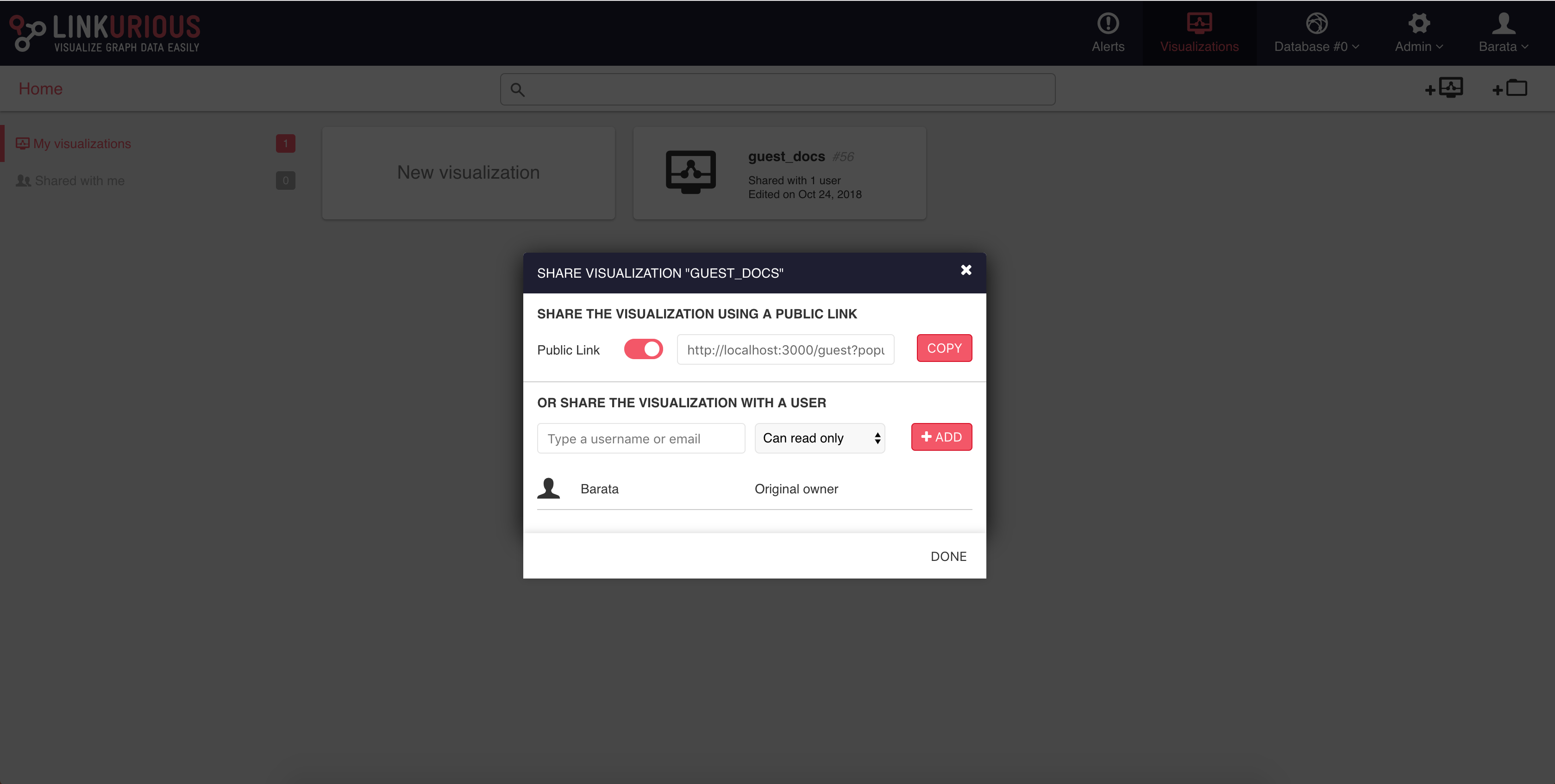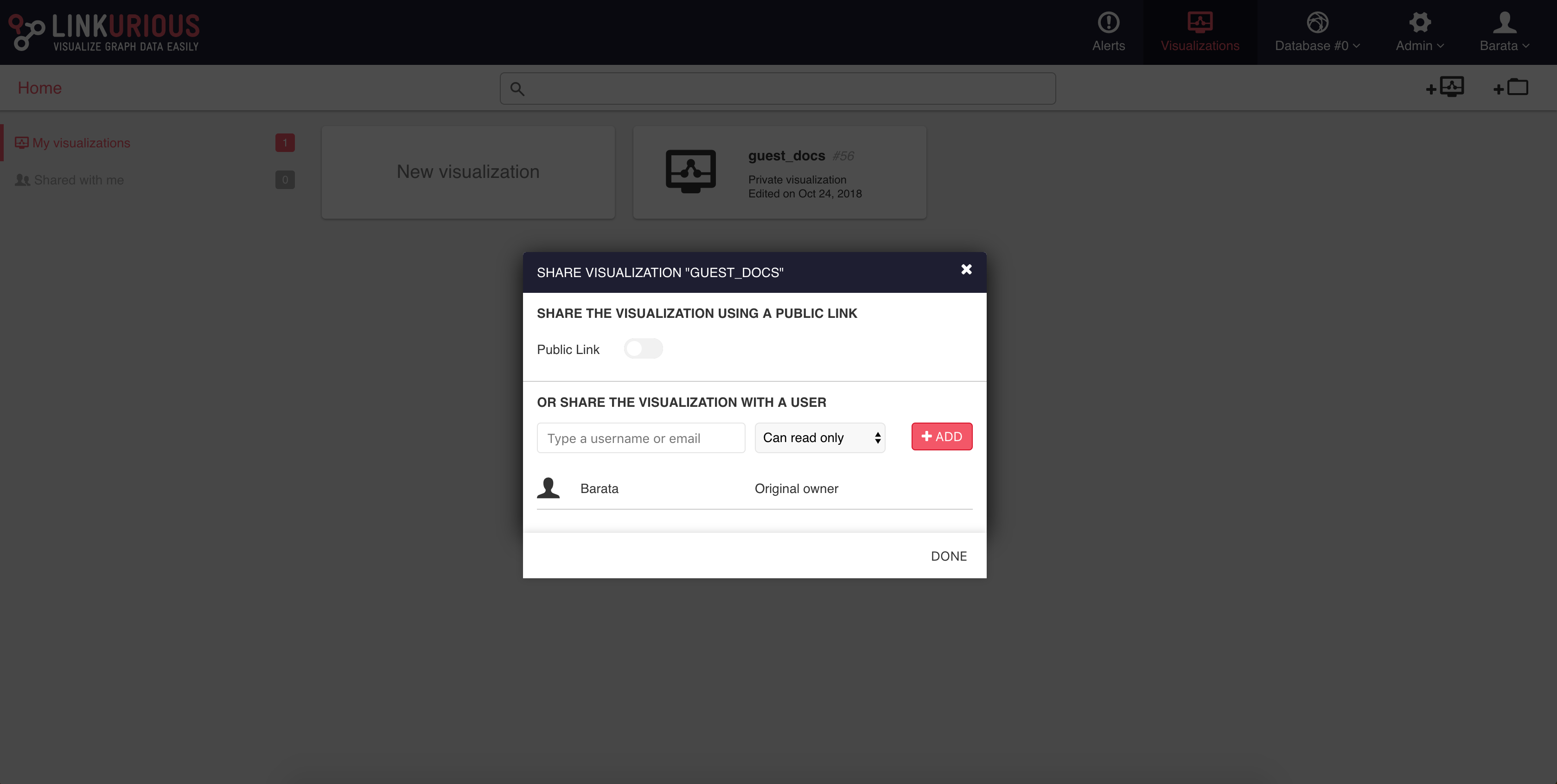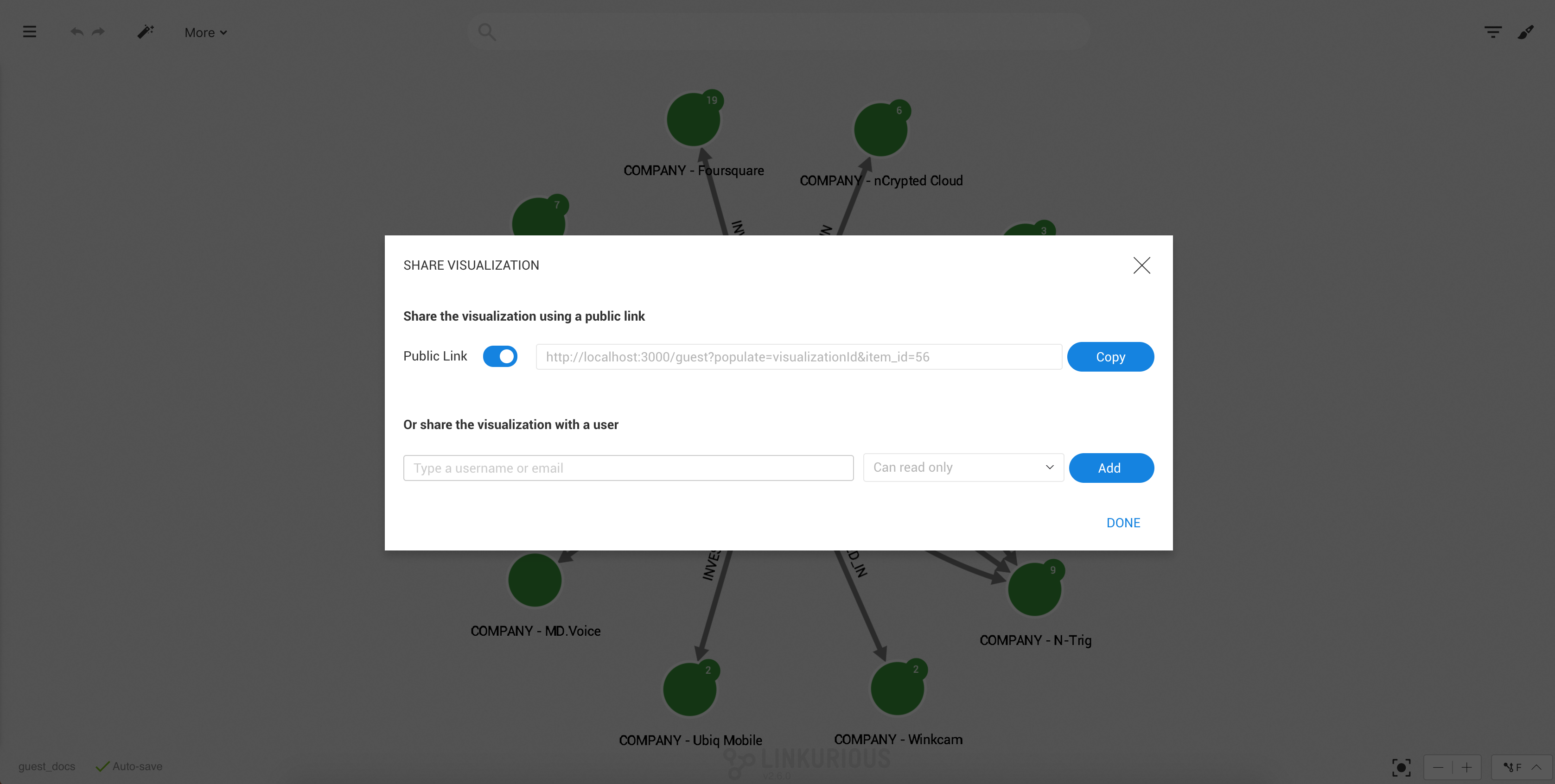 - "Public link"-sharing: the Guest mode is very similar to the option found in Google Documents and many other applications. You get a URL that you can share to people that don't have an account on Linkurious Enterprise.