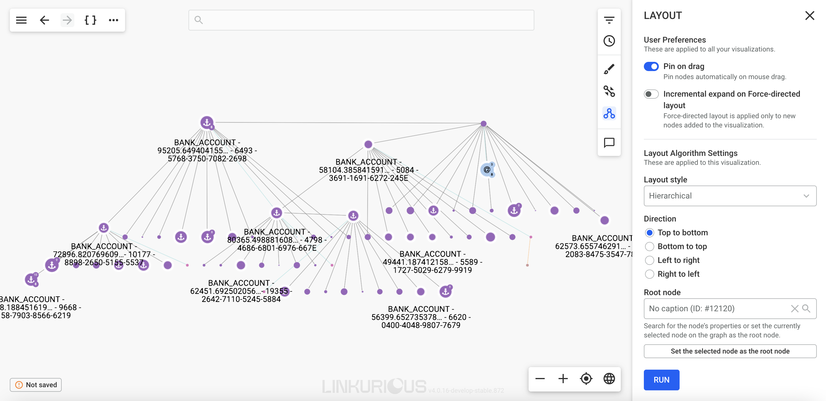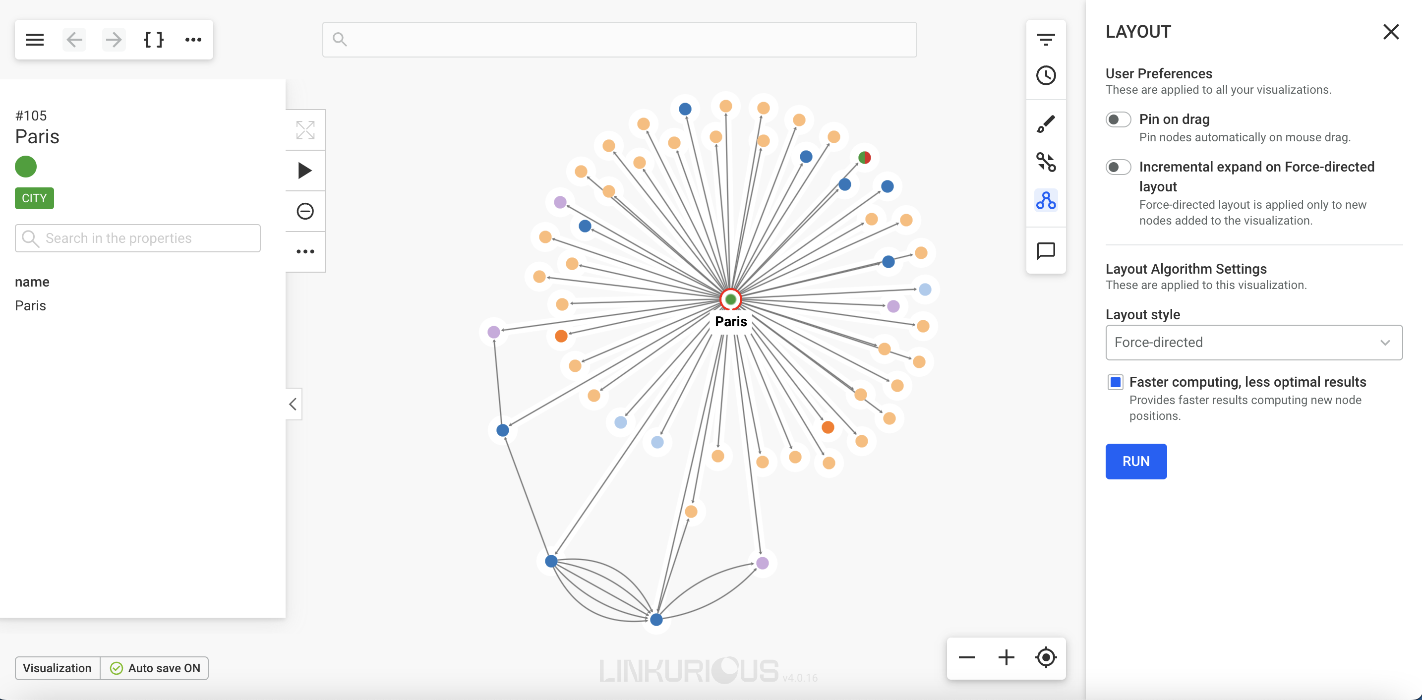 Using a layout on the graph brings clarity. To refresh the current layout, right-click on the background, or click on the "More" menu at the top of the workspace, and choose "Refresh layout" in the context menu.