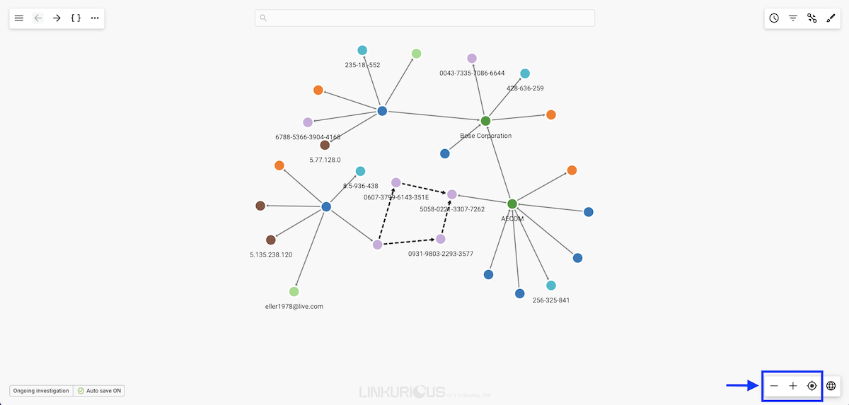 At the bottom right of the workspace there are controls allowing to "Zoom in", "Zoom out", and "Locate", i.e. center the screen on the current selection.