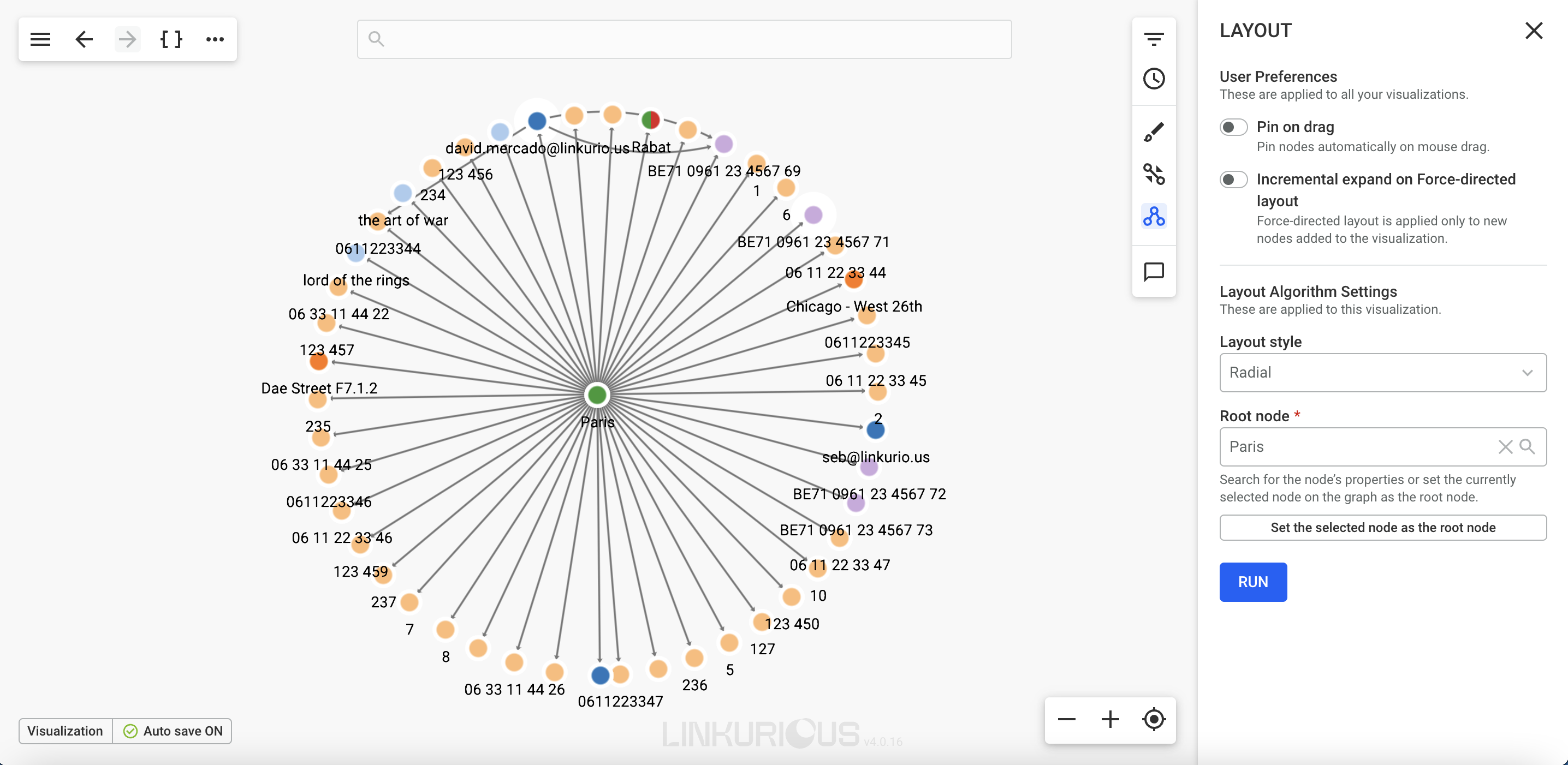 Radial layouts position nodes around the currently selected node (used as center of the layout) based on their graph-theoretical distance (shortest path in the graph). This is useful for revealing layers in data and for drawing the rest of the graph in its relation to the pre-defined focus node.