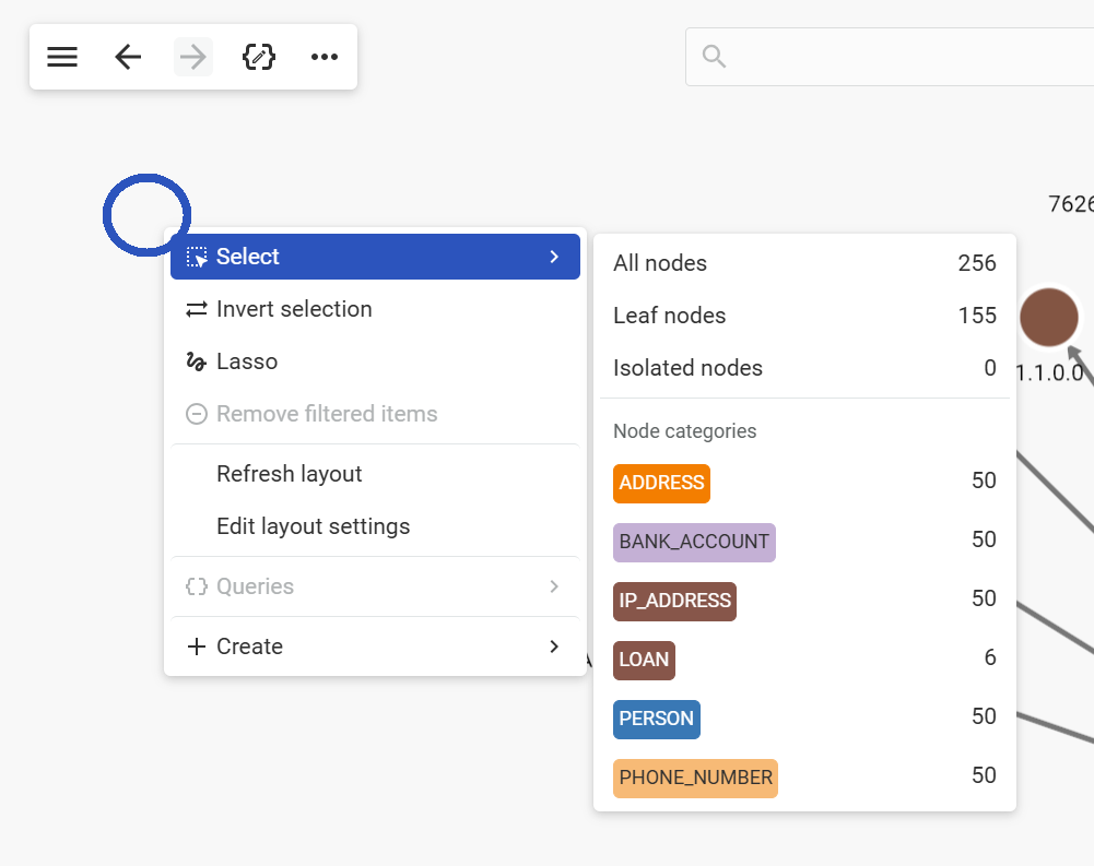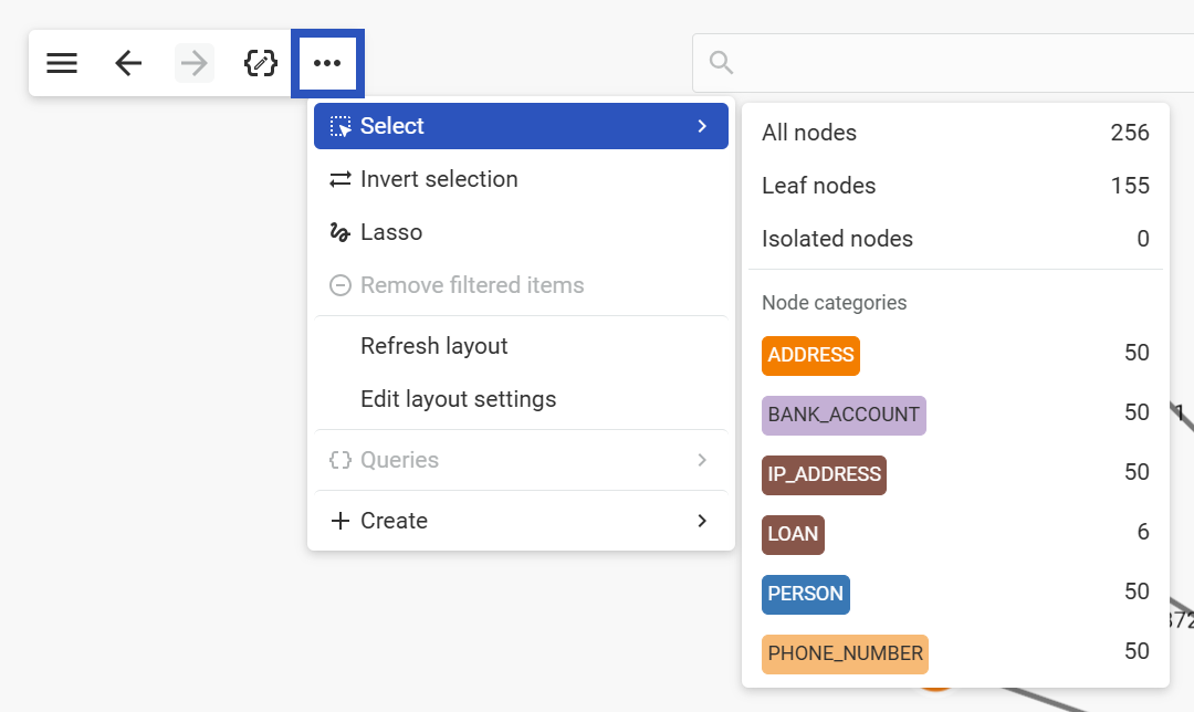 All nodes: select all the nodes in your current visualization,Leaf nodes: select the nodes in your visualization that have only one edge,Isolates: select the nodes in your visualization that have no edges.Node Categories: select the nodes in your visualization by categories