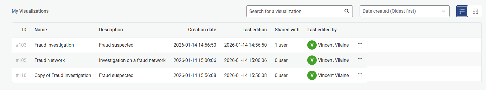 In order to quickly find the visualization you want to work on, you can search, order and change the way they are displayed in the dashboard.