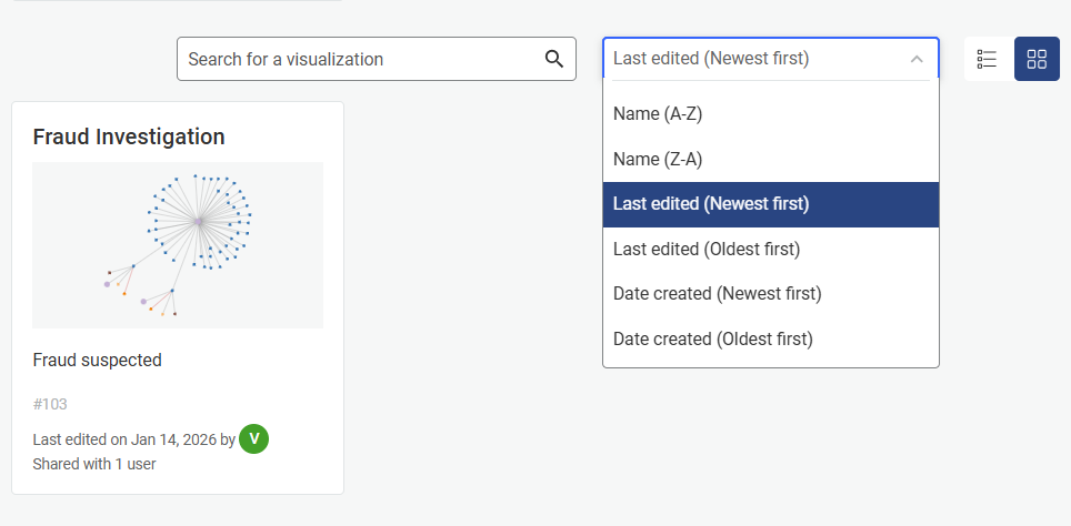 Select the visualisation display order from the dropdown menu next to the search bar. You can choose to order your visualizations by Name, Last edition date, or Creation Date.