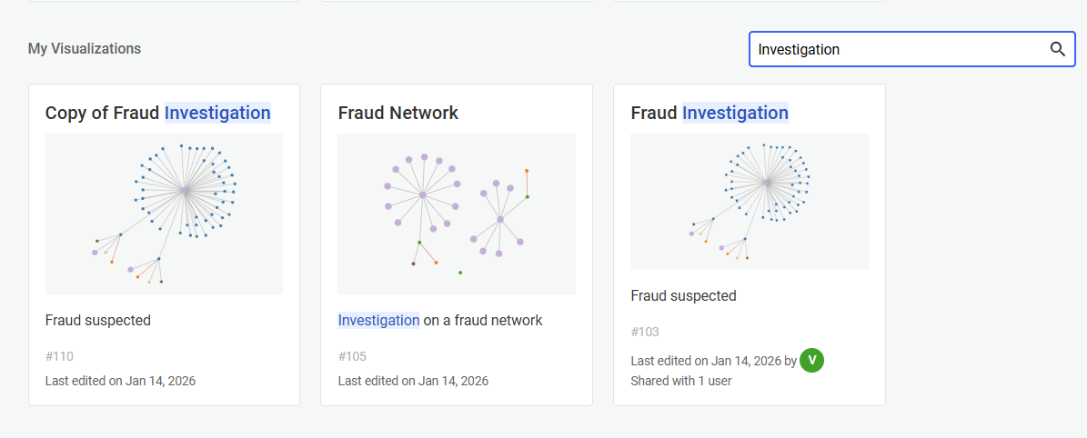 Click in the search bar on the right hand side and type some text. You can search the name or description content. Visualizations will be filtered based on your search.